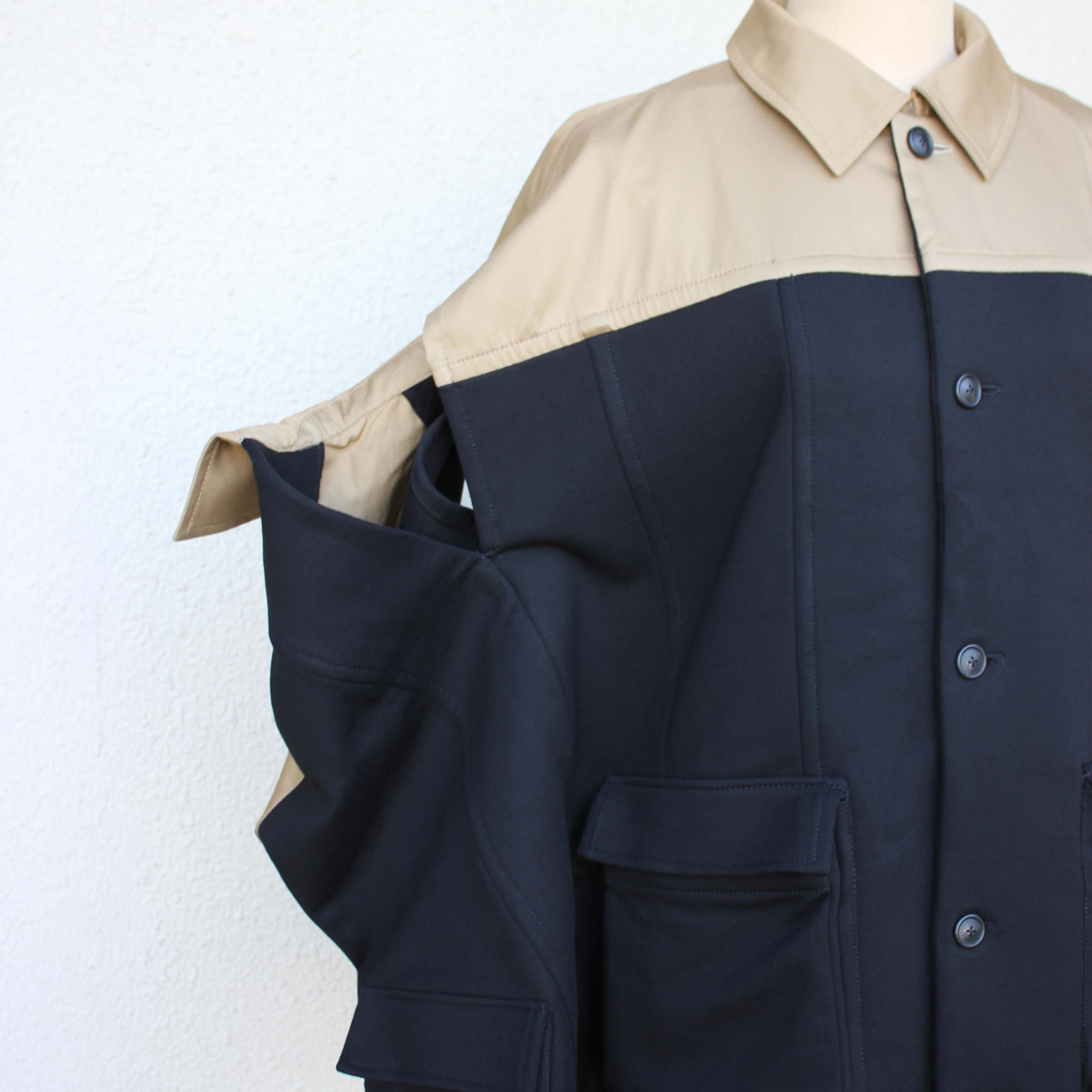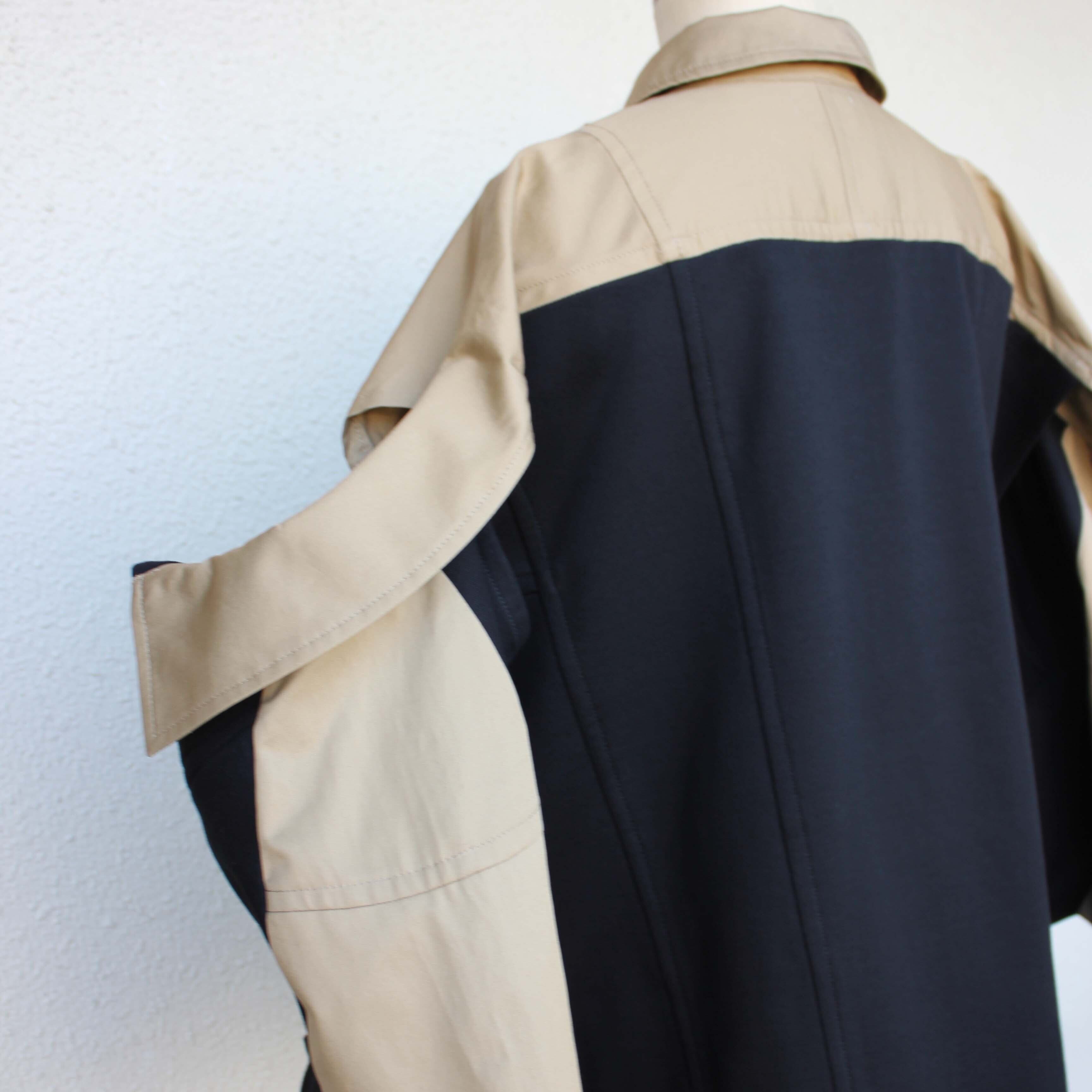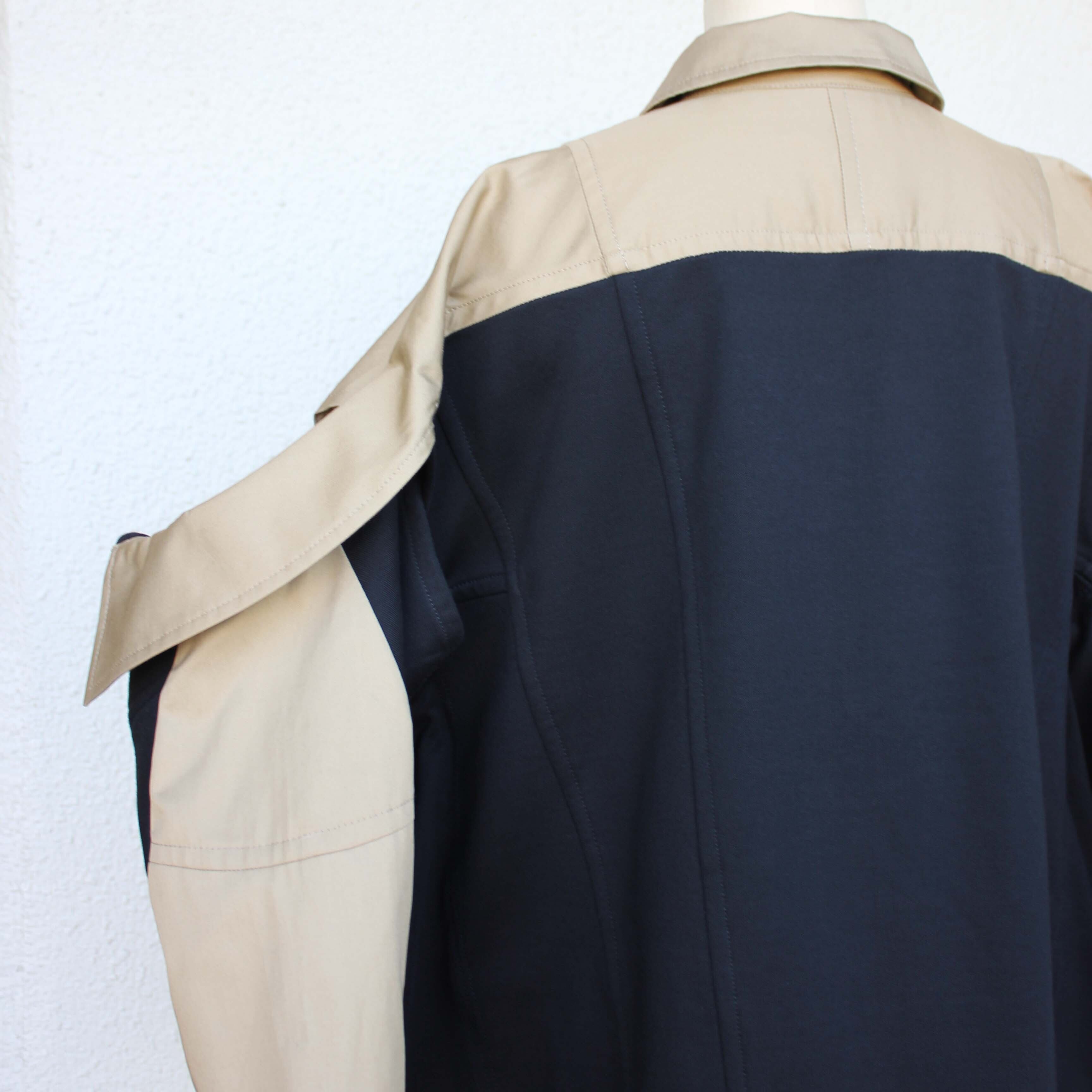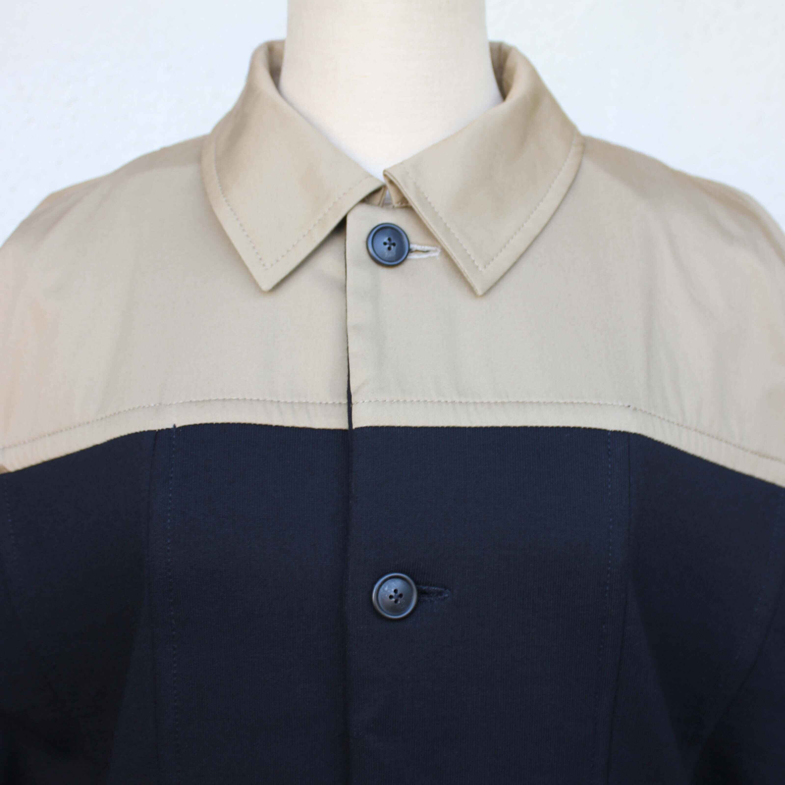 ゆったりとした身幅に、ベージュの切り替えがアクセントとして映えるデザイン性の高いジャケットです。