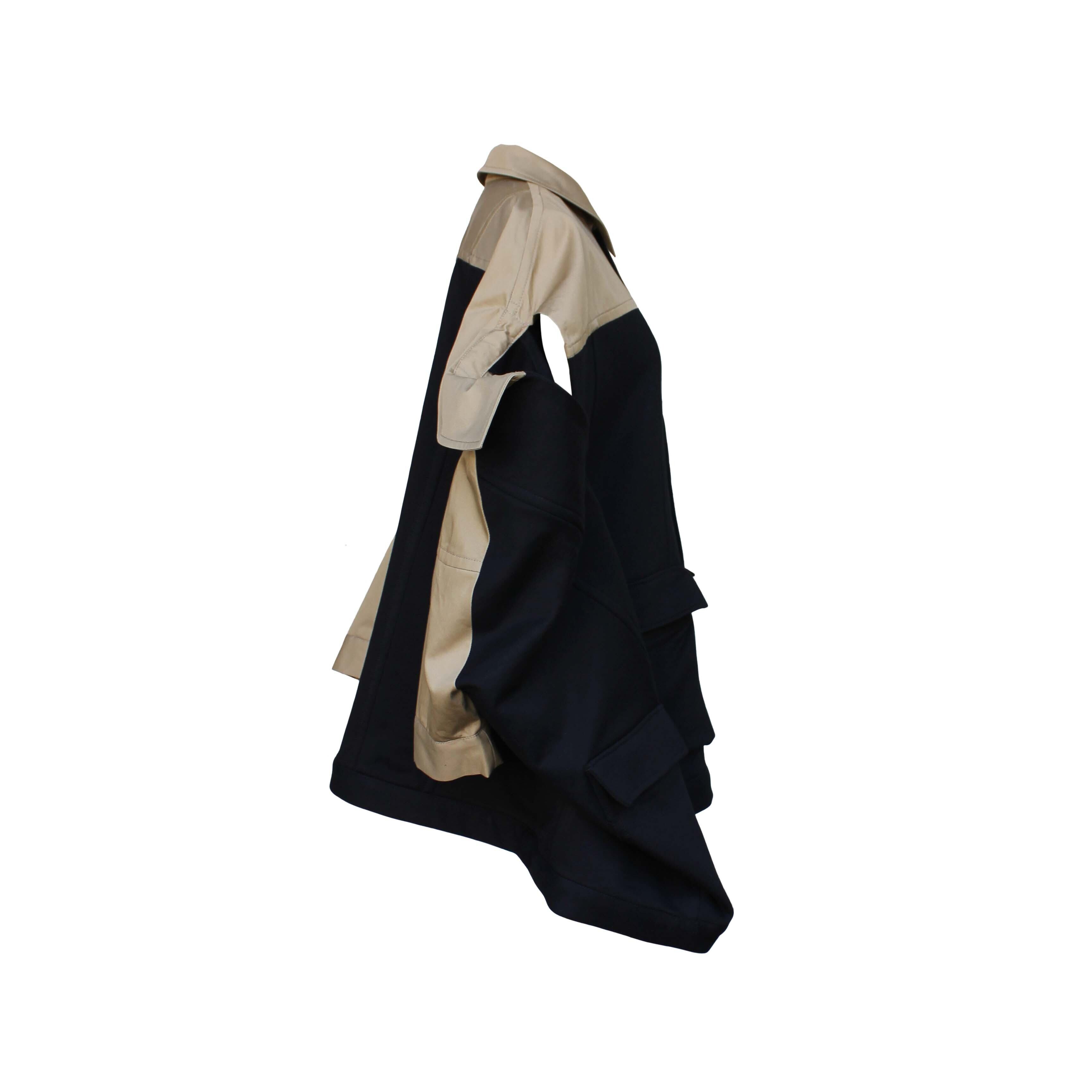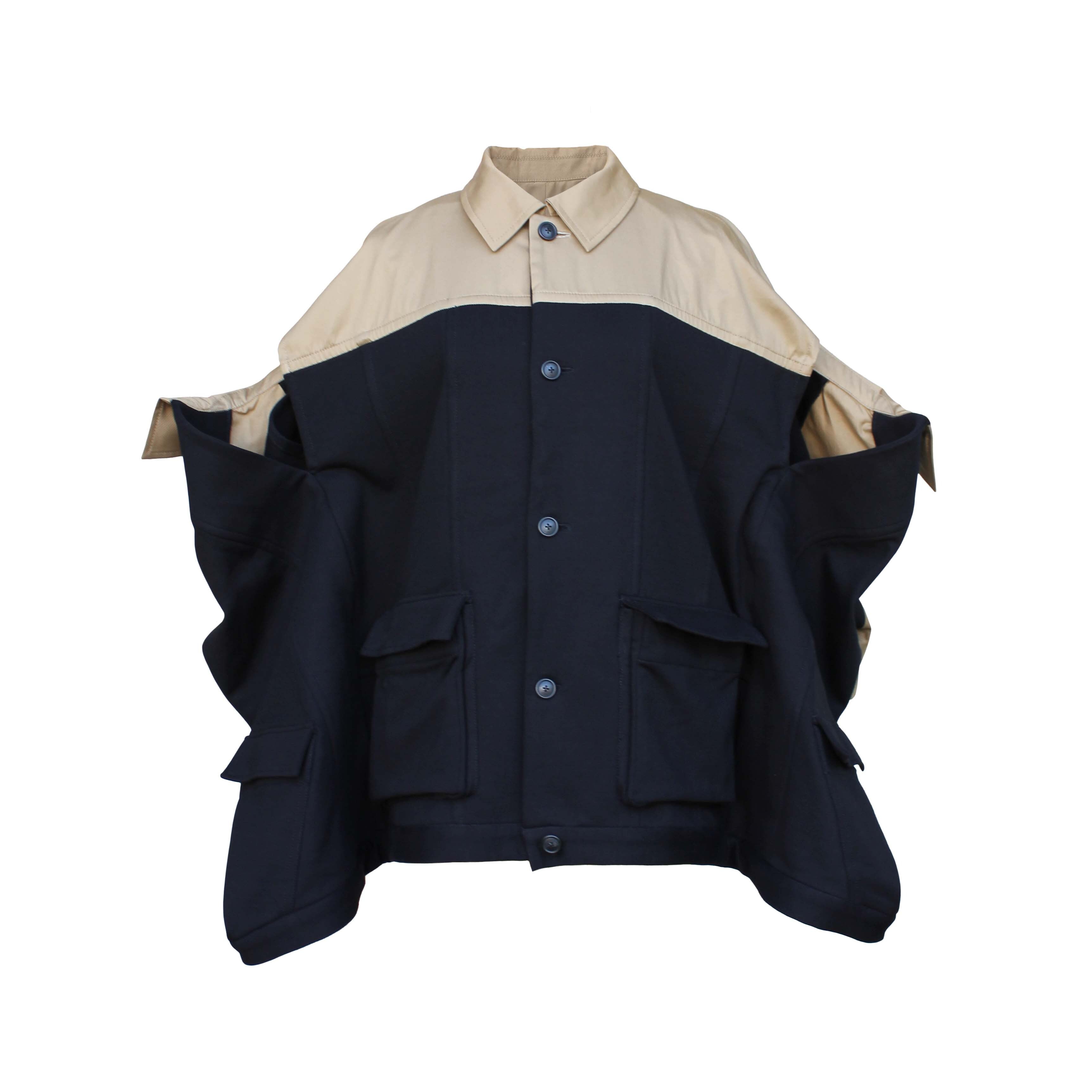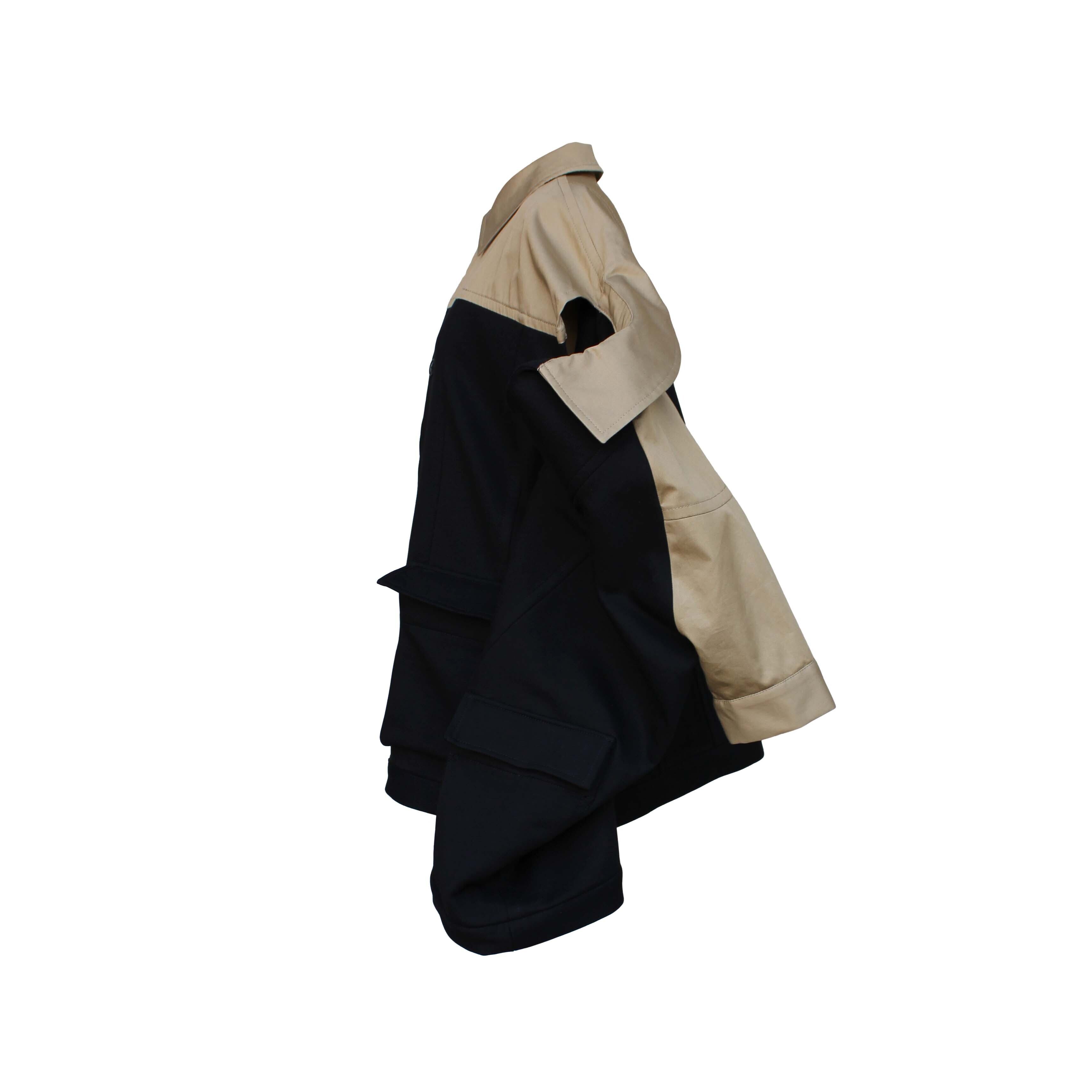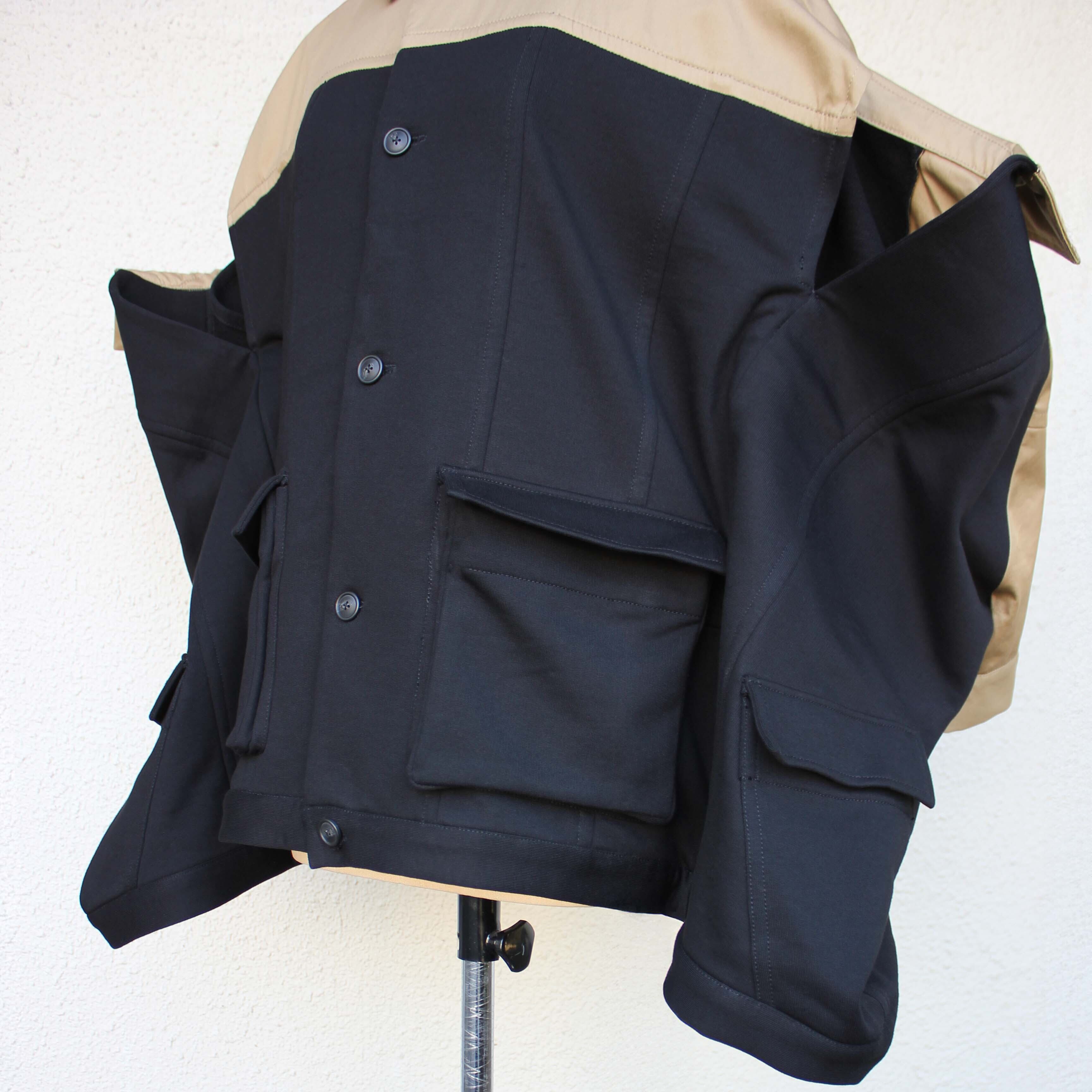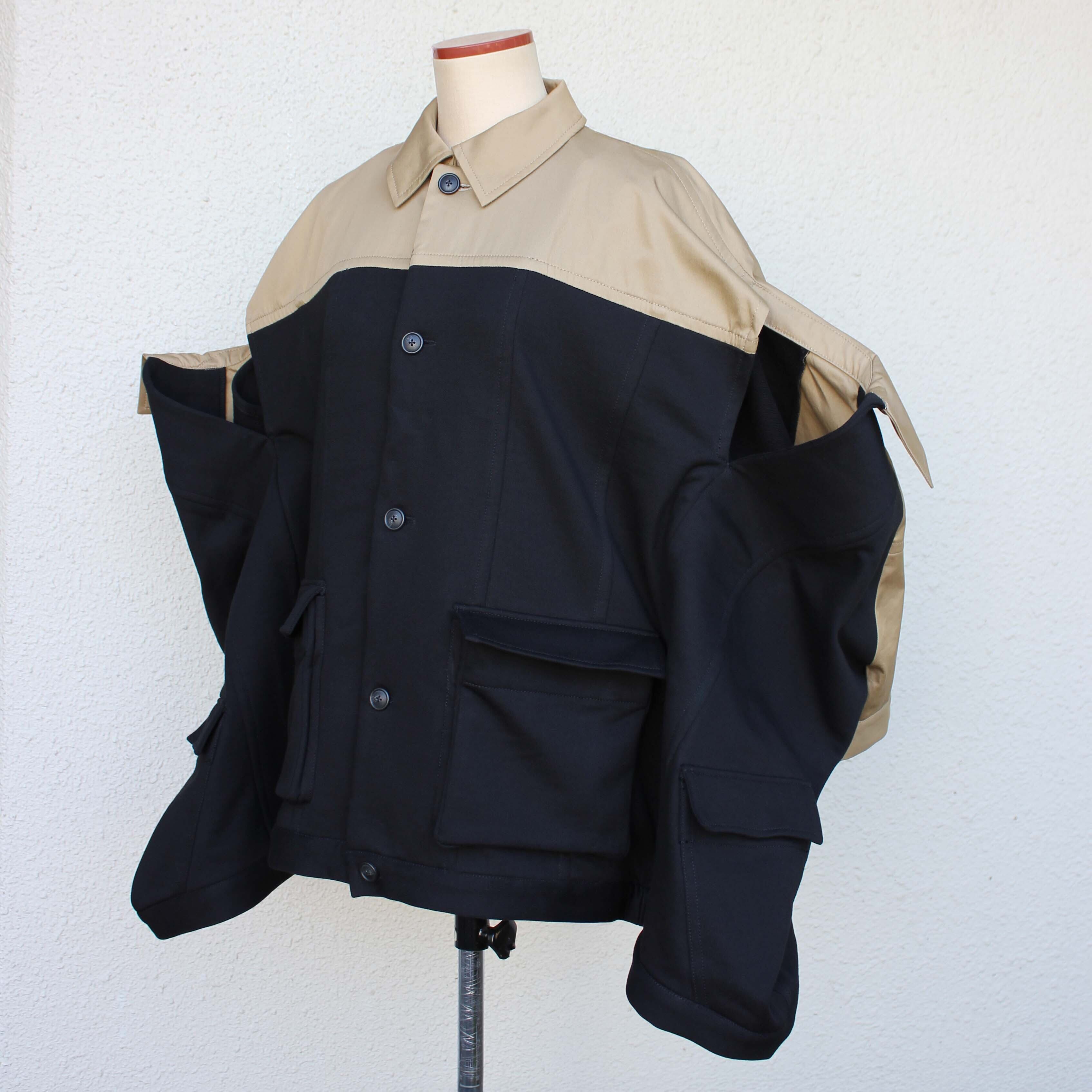 ゆったりとした身幅に、ベージュの切り替えがアクセントとして映えるデザイン性の高いジャケットです。