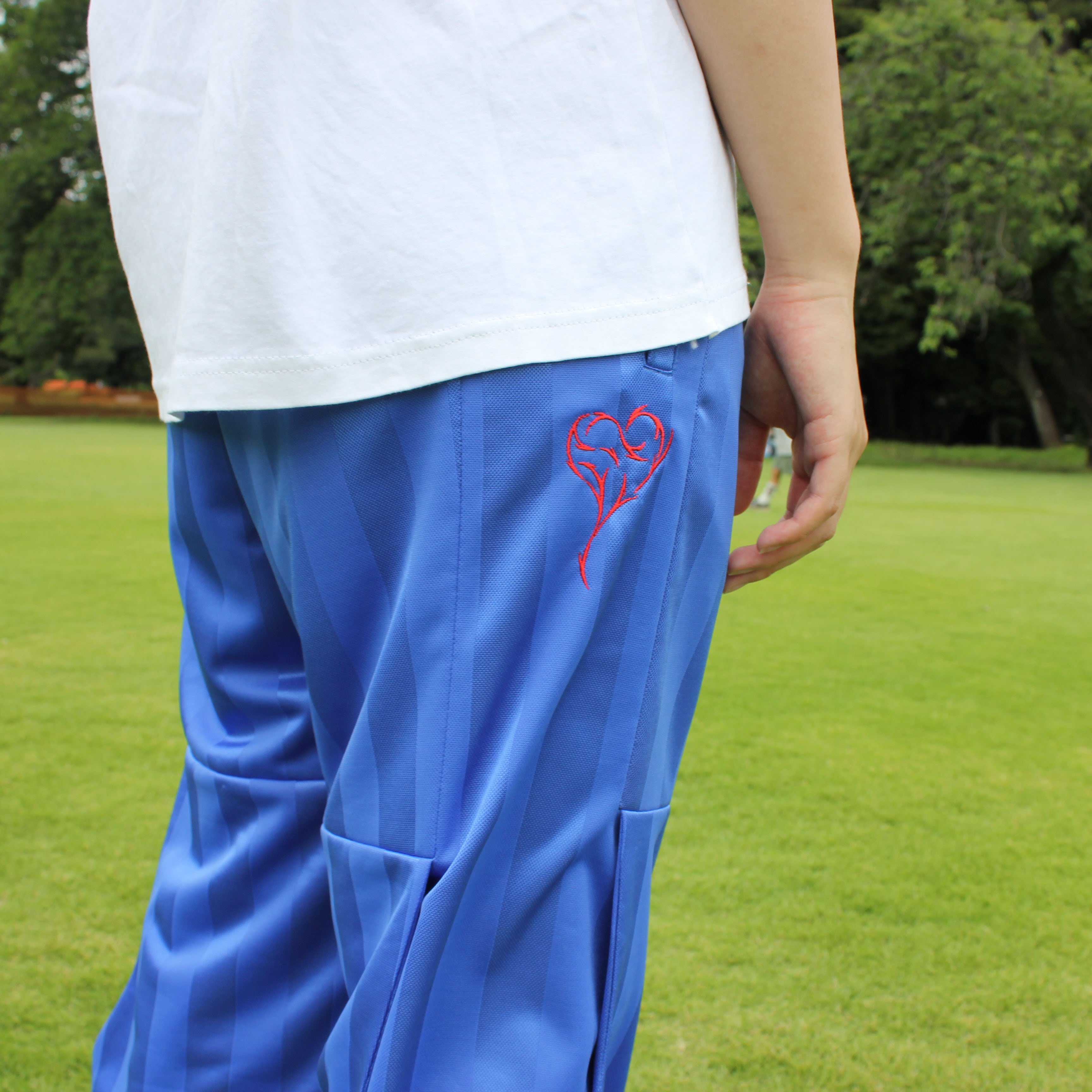 肌触りの良いジャージ素材を使用し、両脇にはブランドロゴとオリジナルのハートモチーフを刺繍しました。