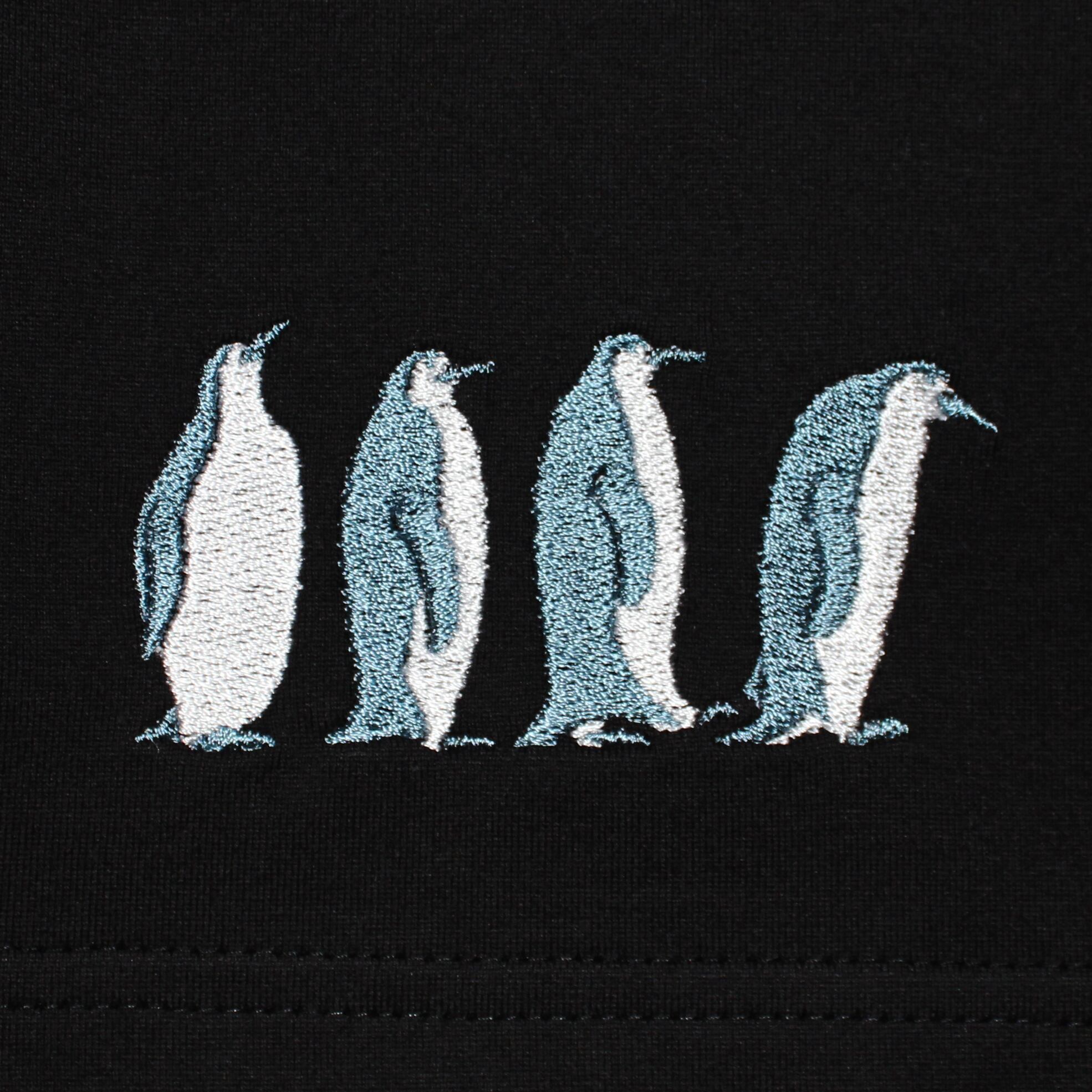4羽のペンギンが右裾に、熱気球に乗ったペンギンが左胸元にそれぞれ刺繍で施されています。