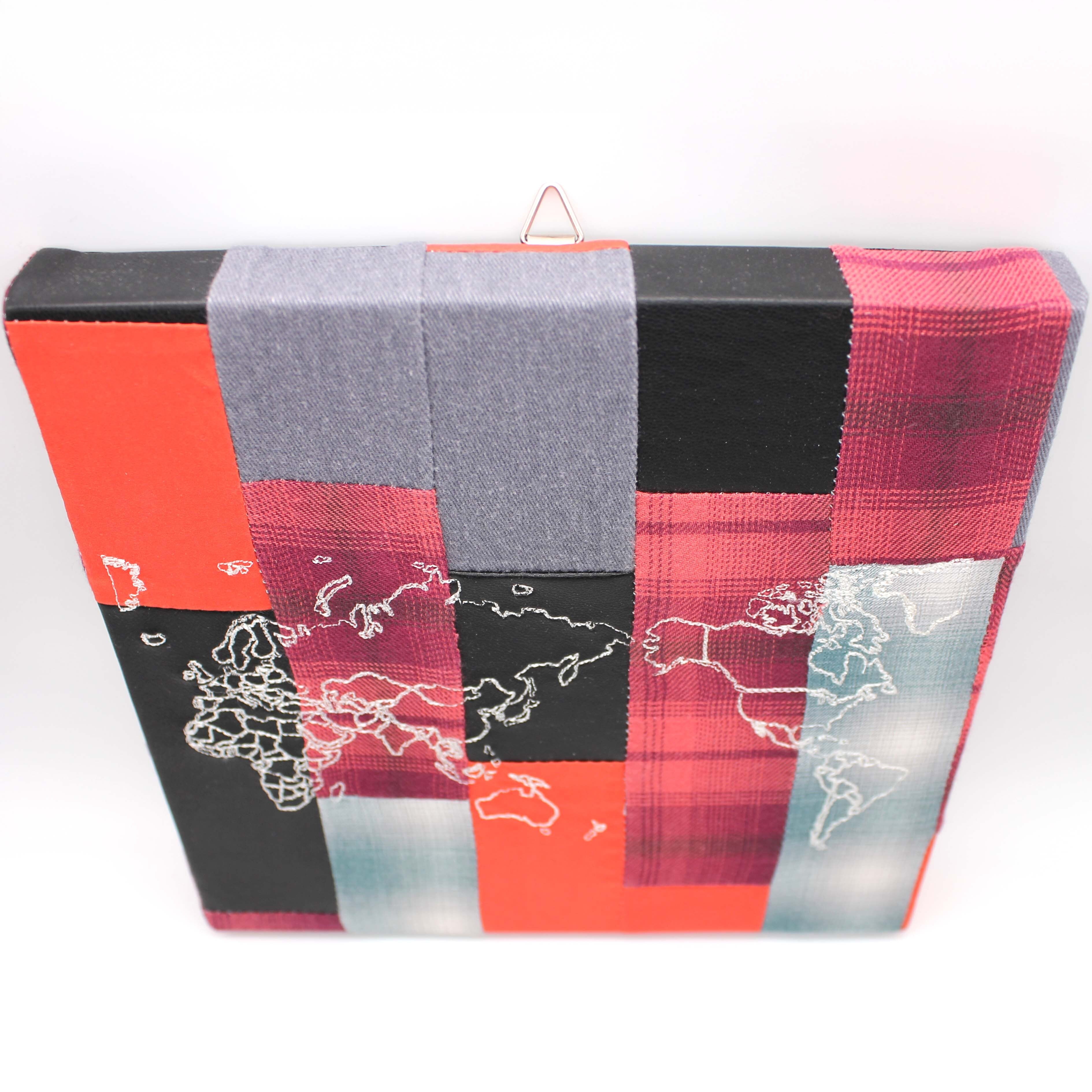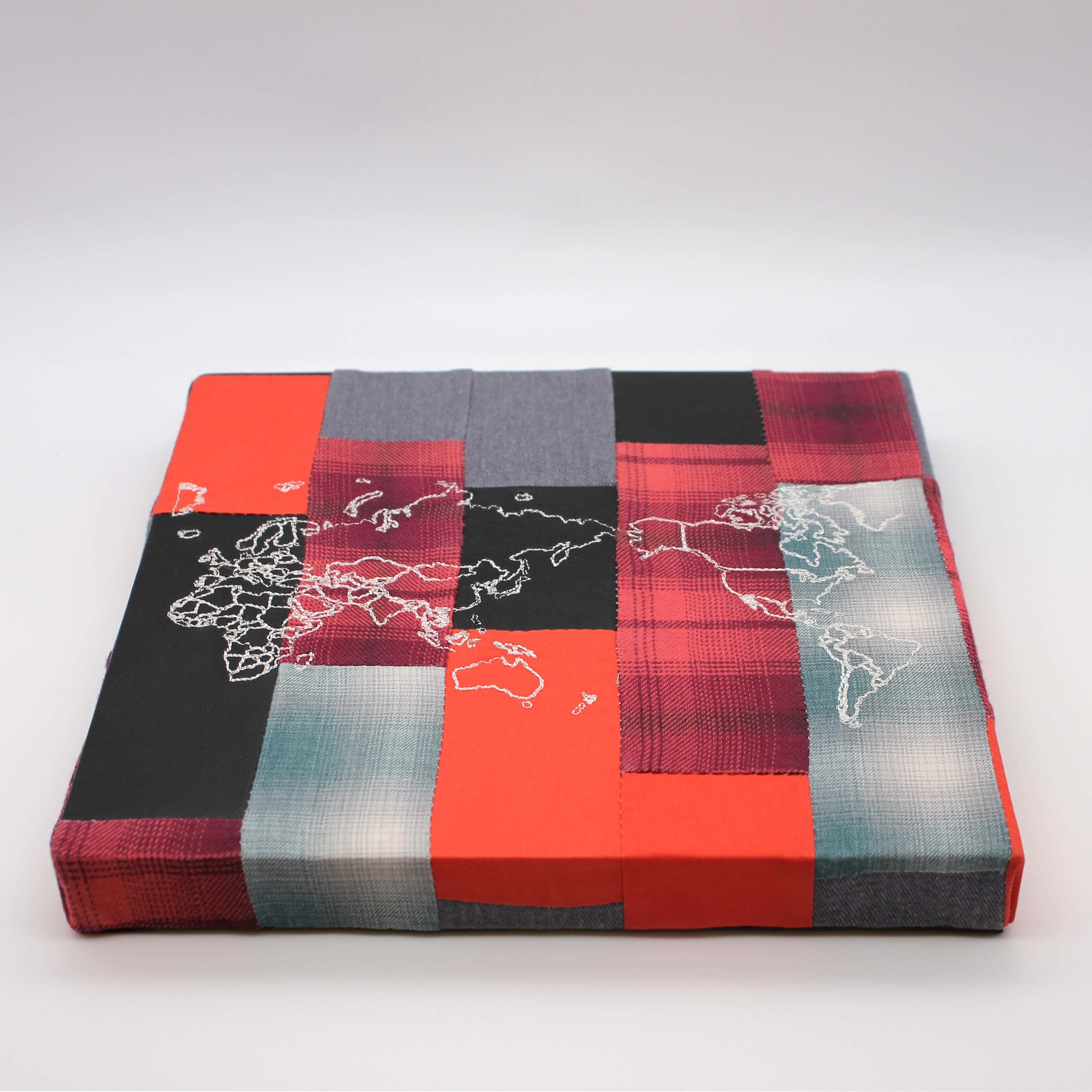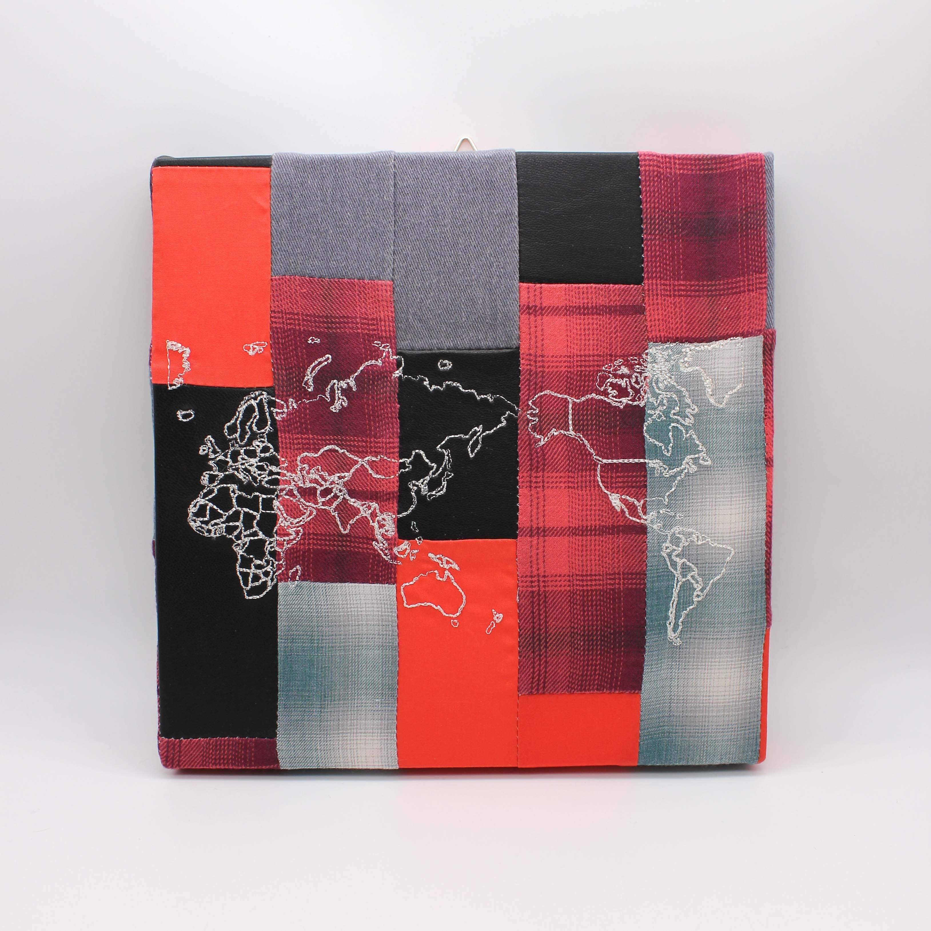 これまでの制作で生まれたハギレをパッチワークにし、その生地に刺繍を施したファブリックパネルです。