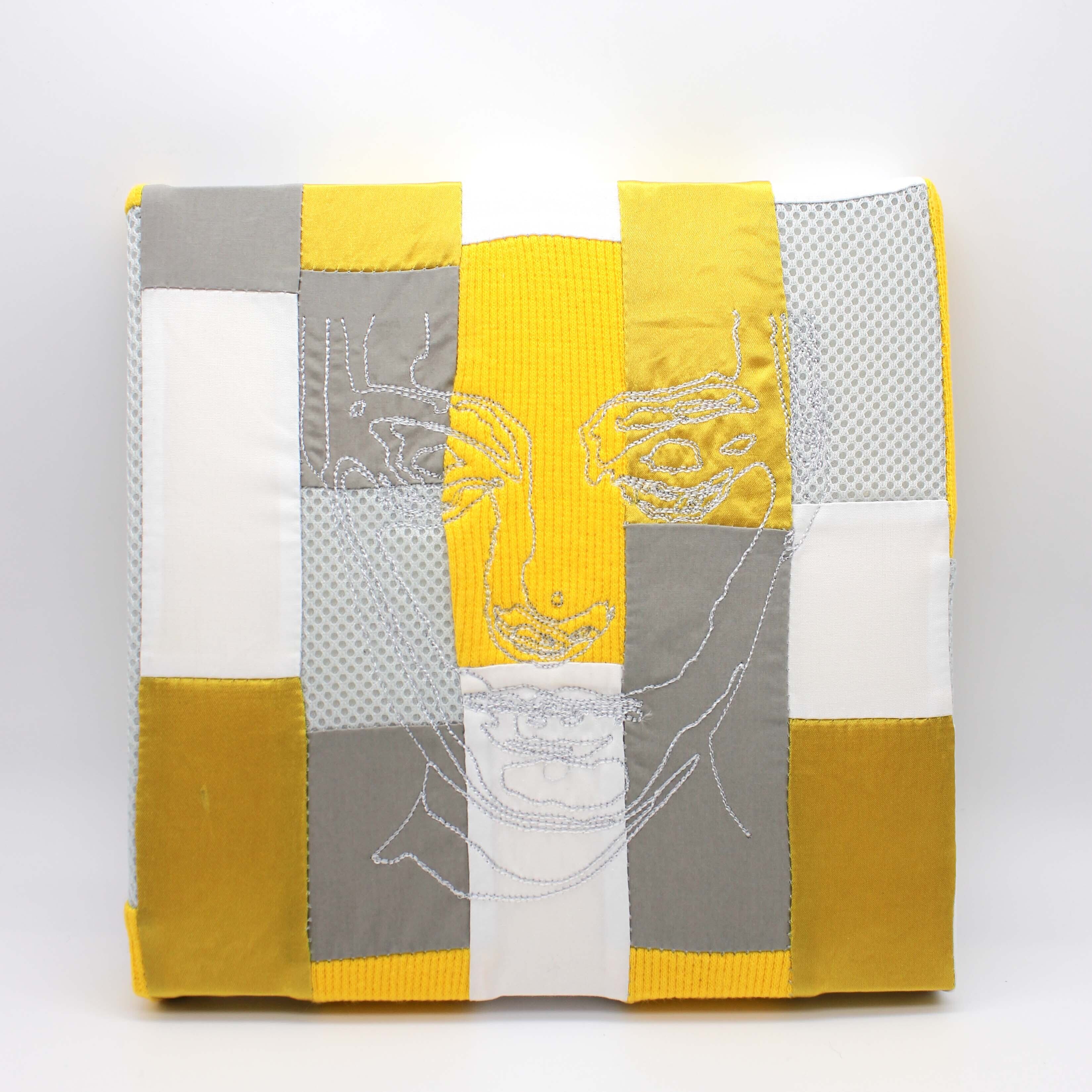 これまでの制作で生まれたハギレをパッチワークにし、その生地に刺繍を施したファブリックパネルです。