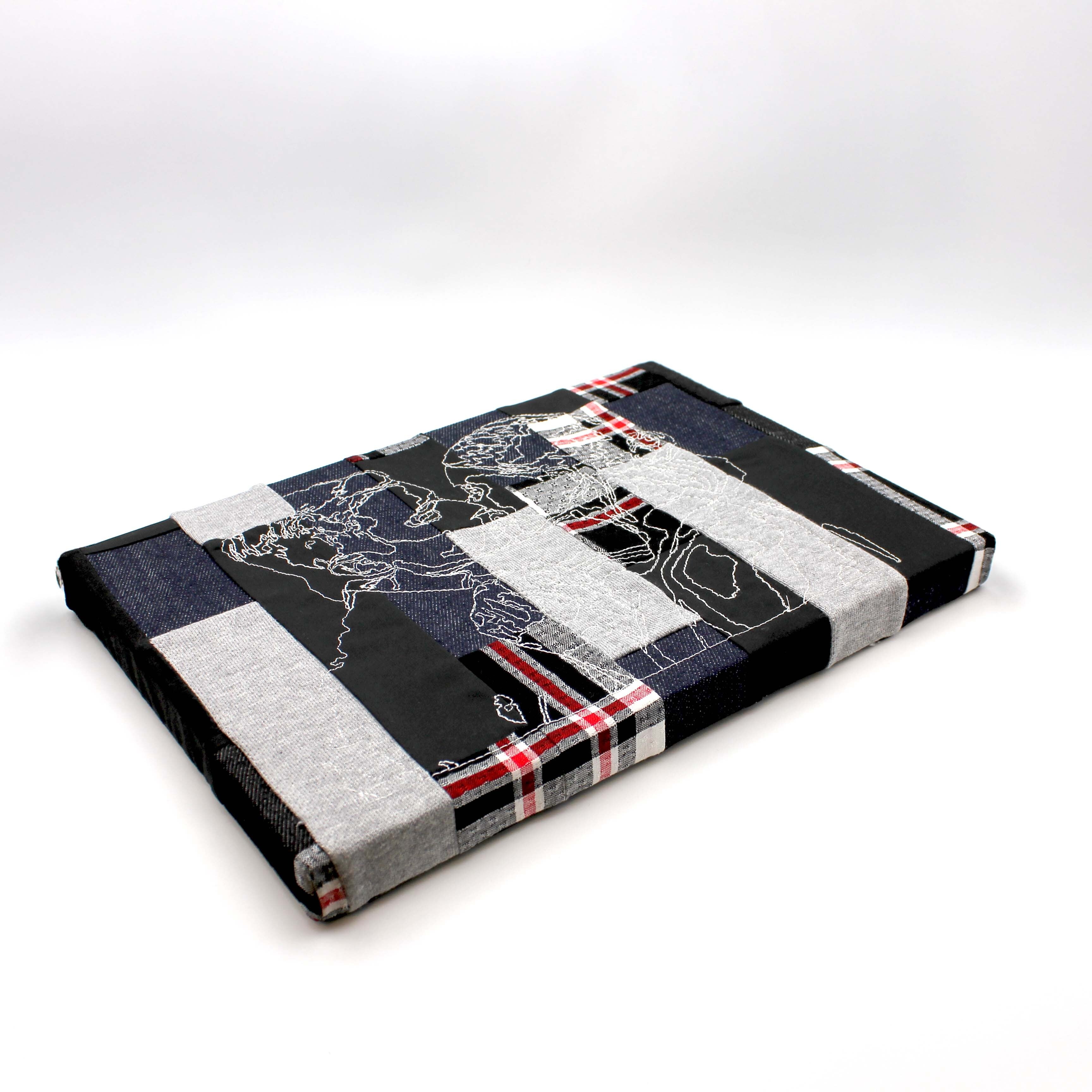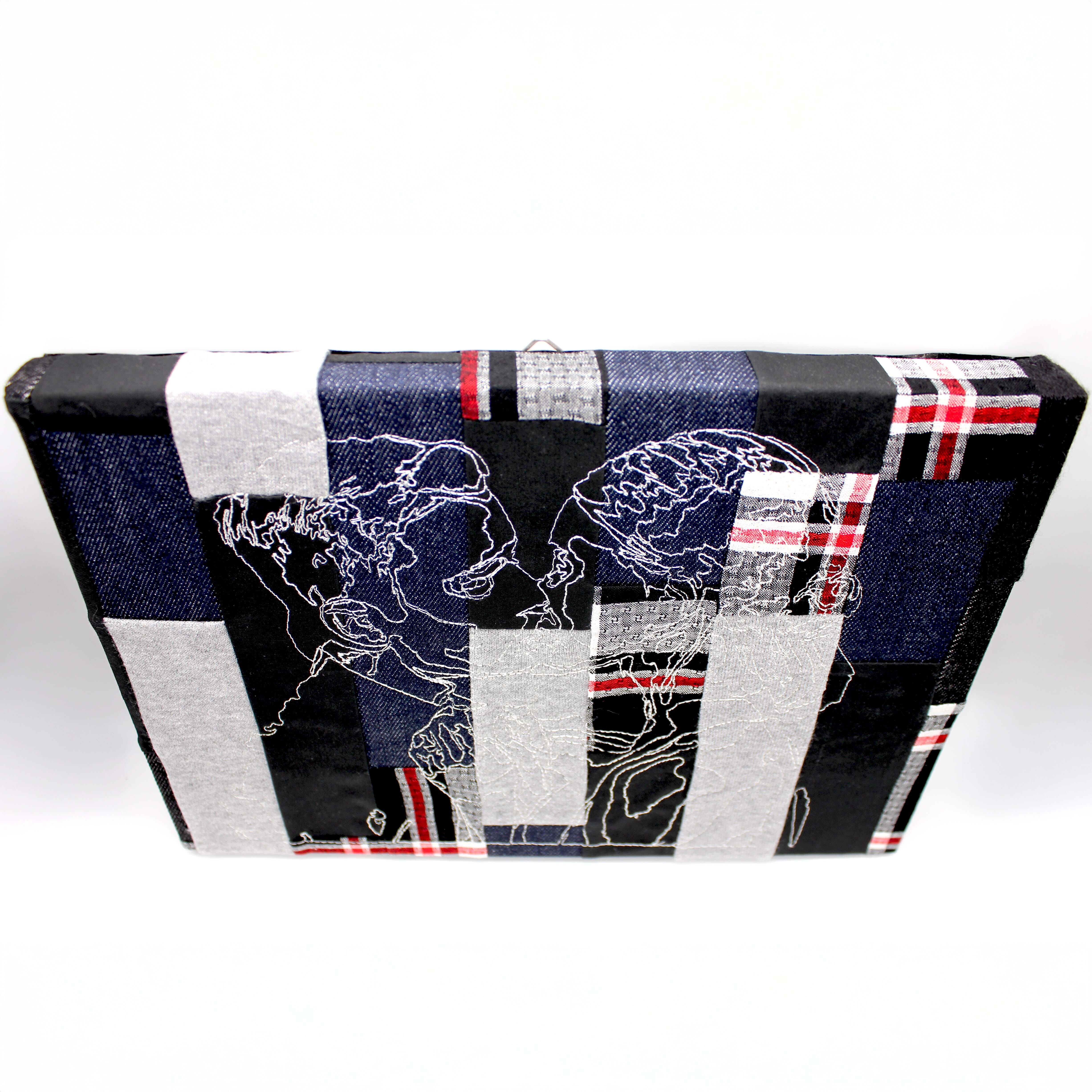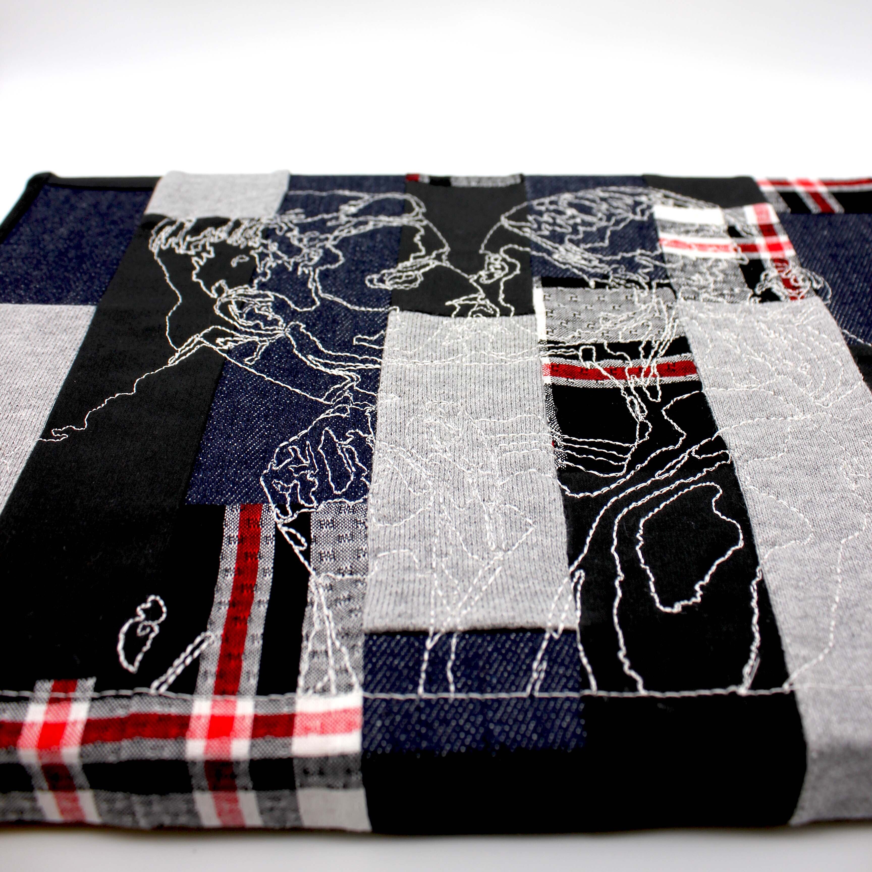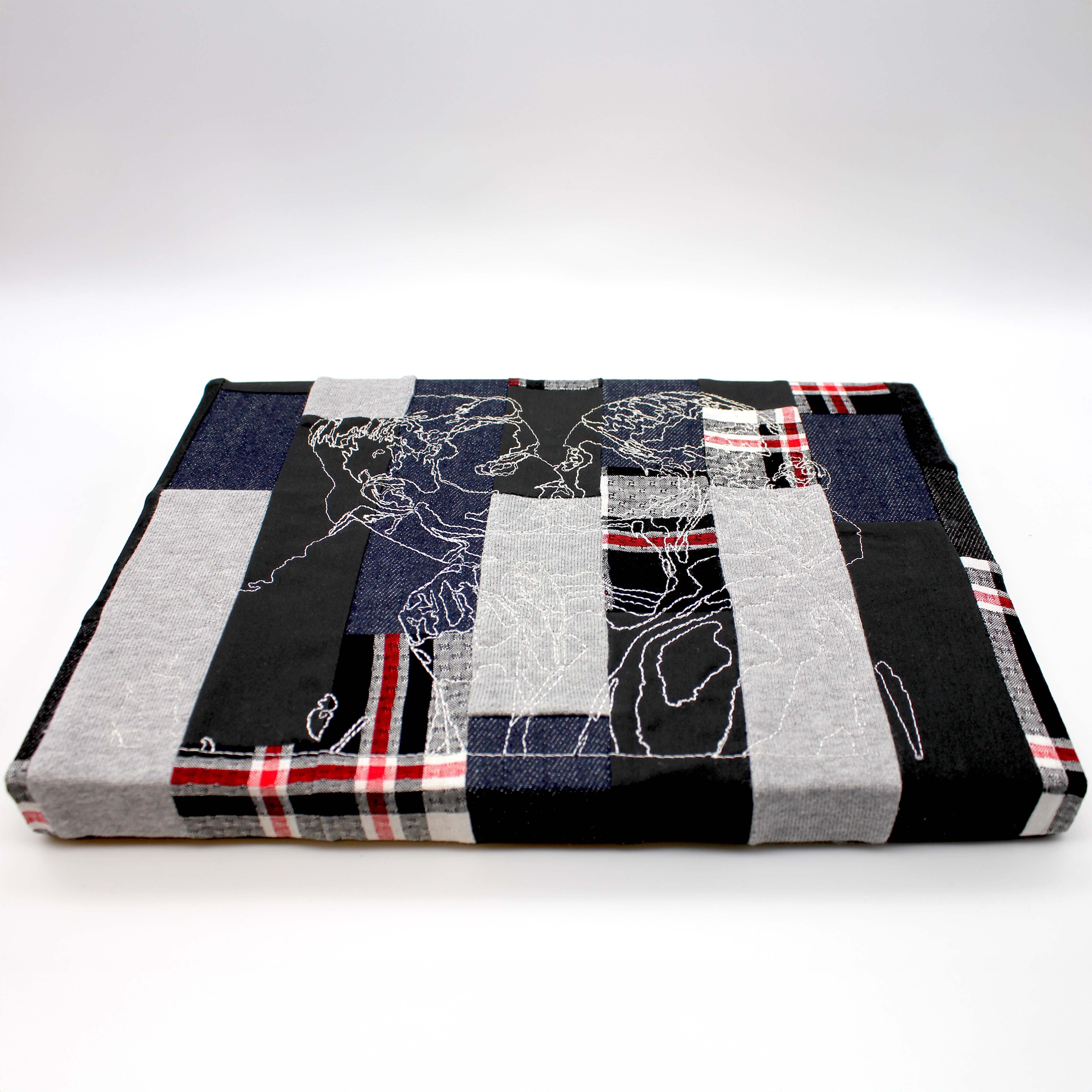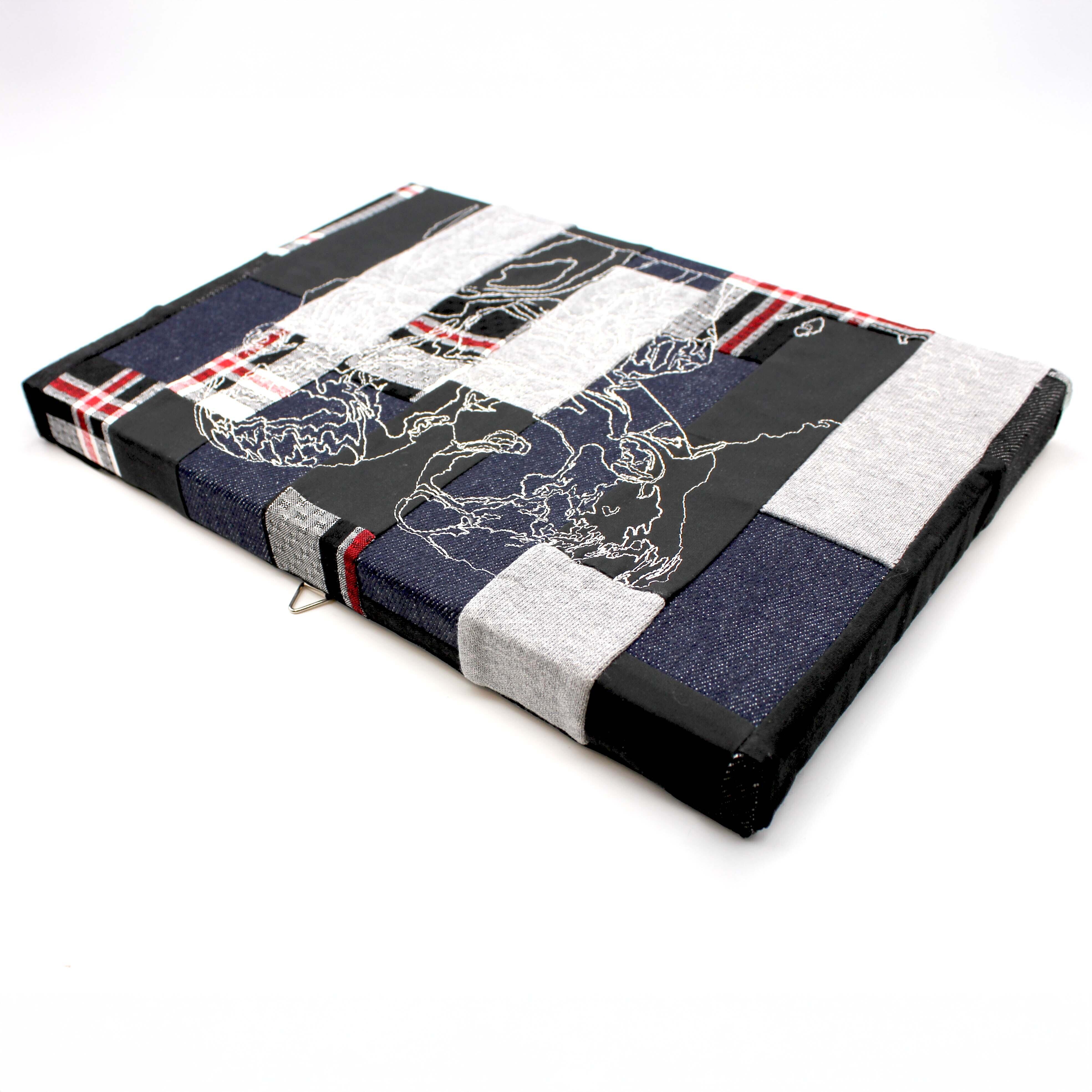 これまでの制作で生まれたハギレをパッチワークにし、その生地に刺繍を施したファブリックパネルです。