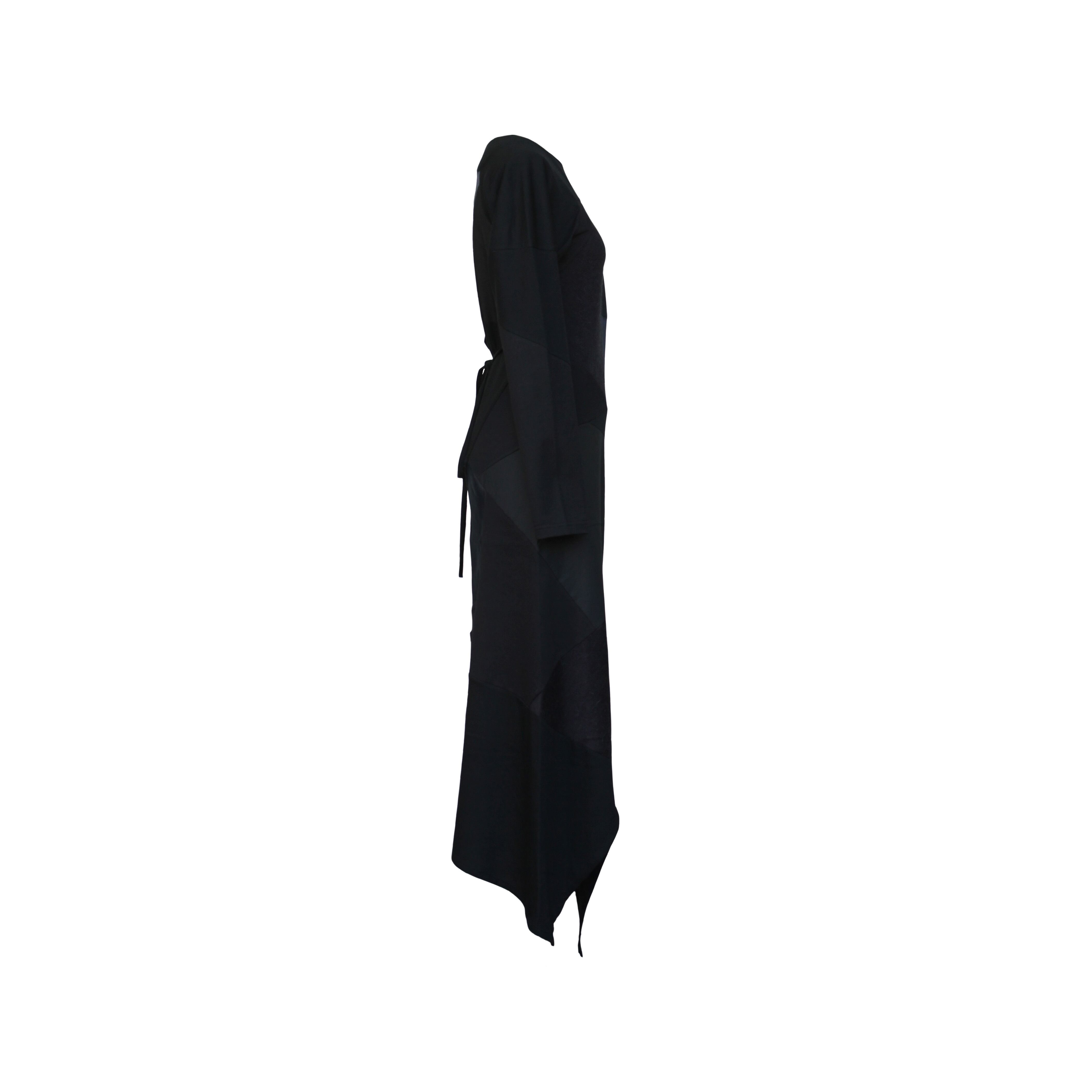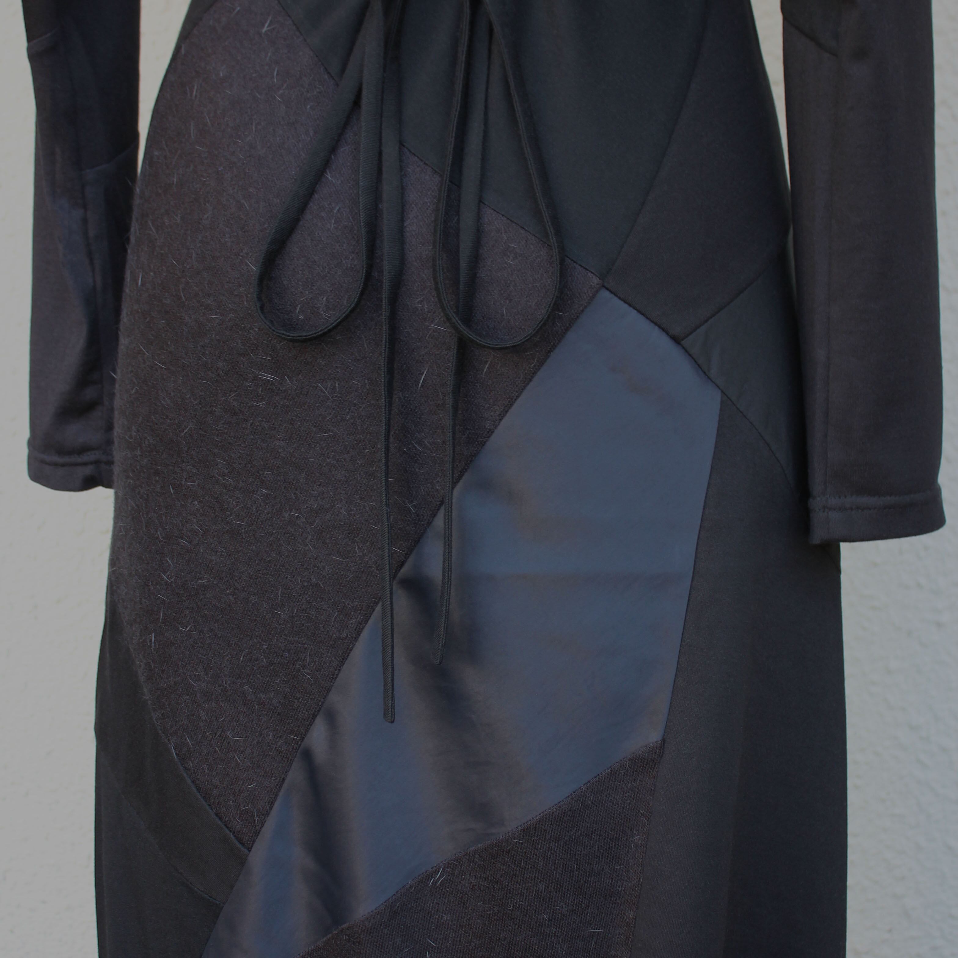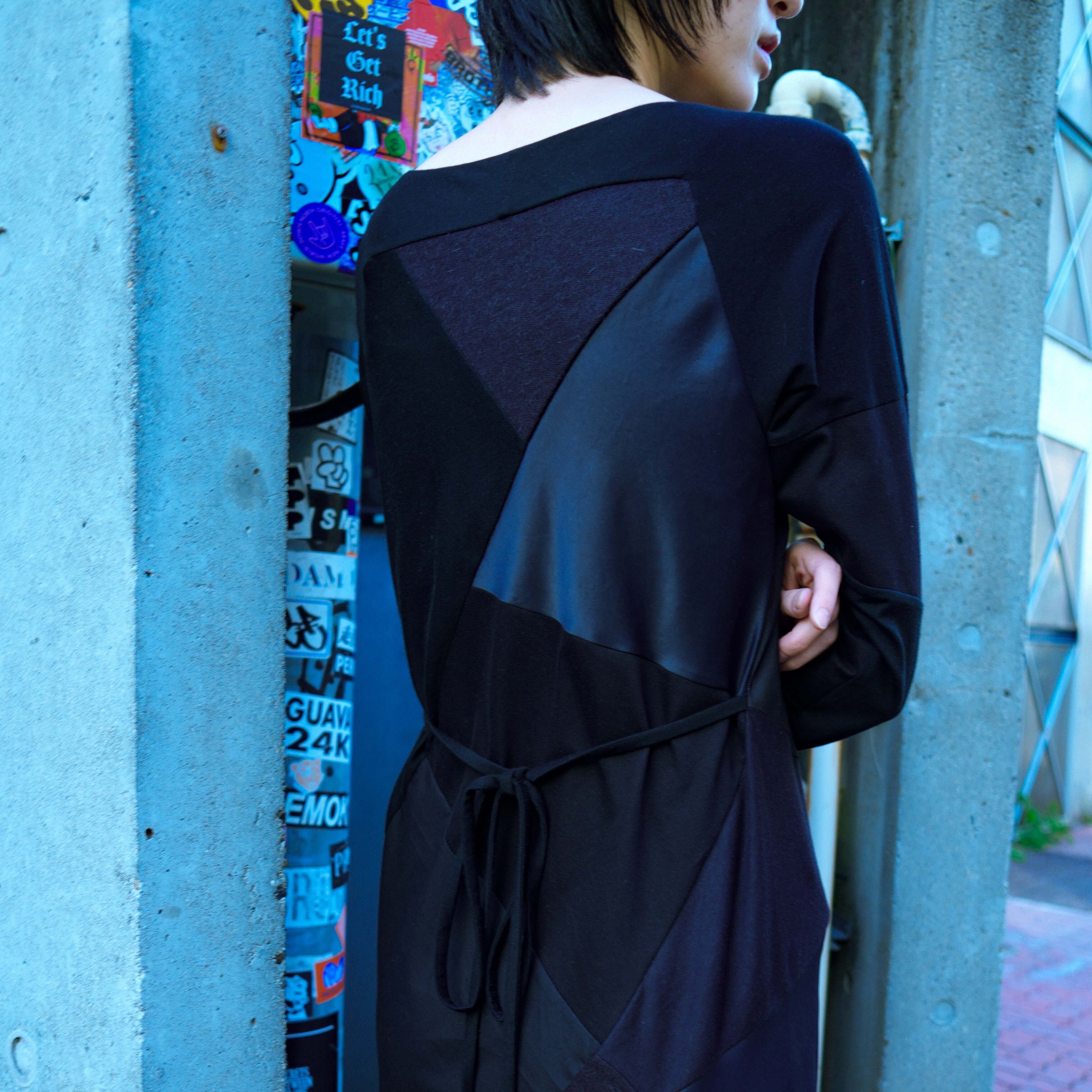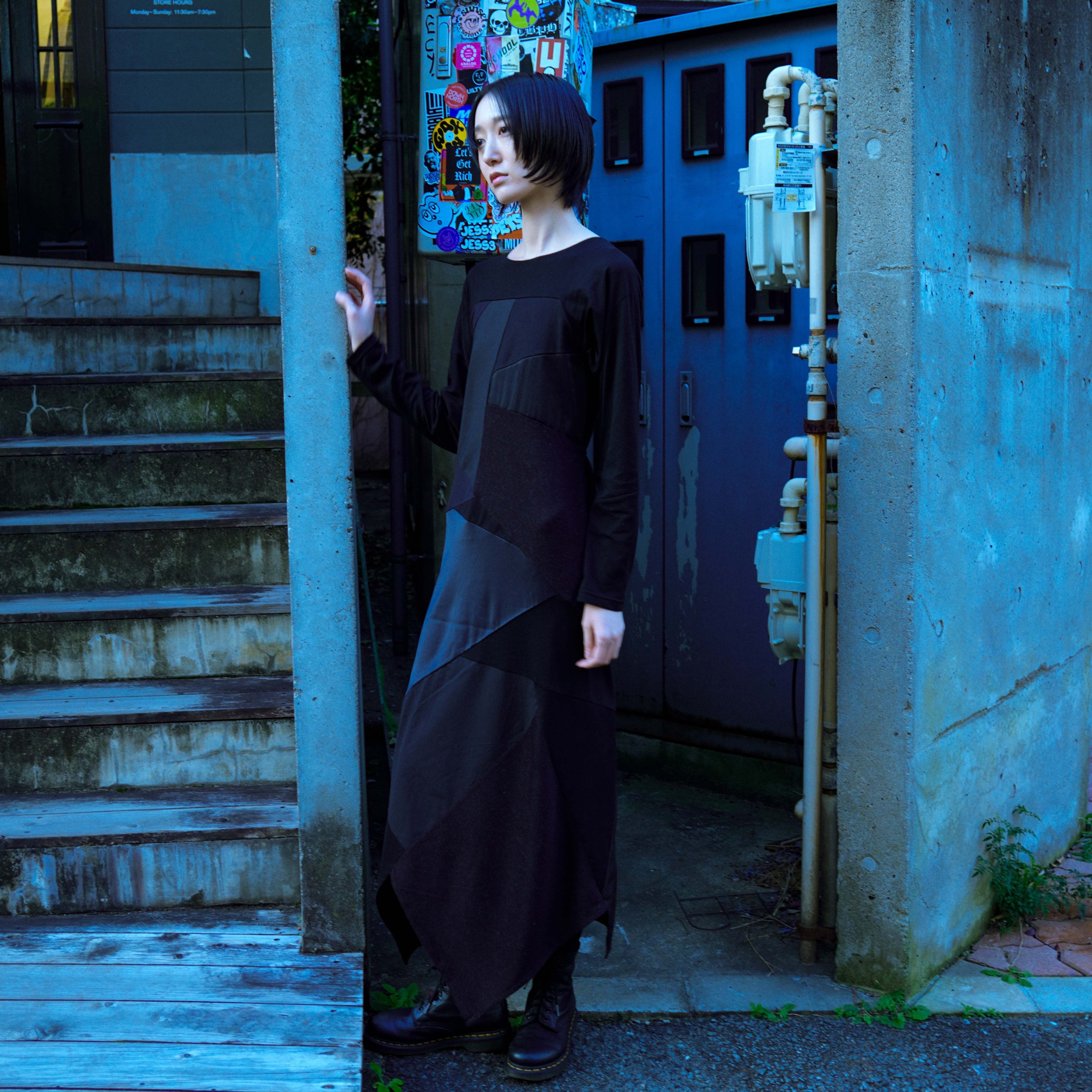 異なる素材を組み合わせた切り替えデザインが目を引き、ロング丈のシルエットが大人の女性にぴったりなアイテムです。